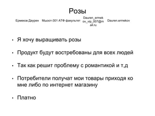 Документ описывает намерение вырастить розы, которые будут востребованы из-за своей романтической привлекательности. Продукты будут доступны как в магазине, так и онлайн. Информация также включает контактные данные автора.