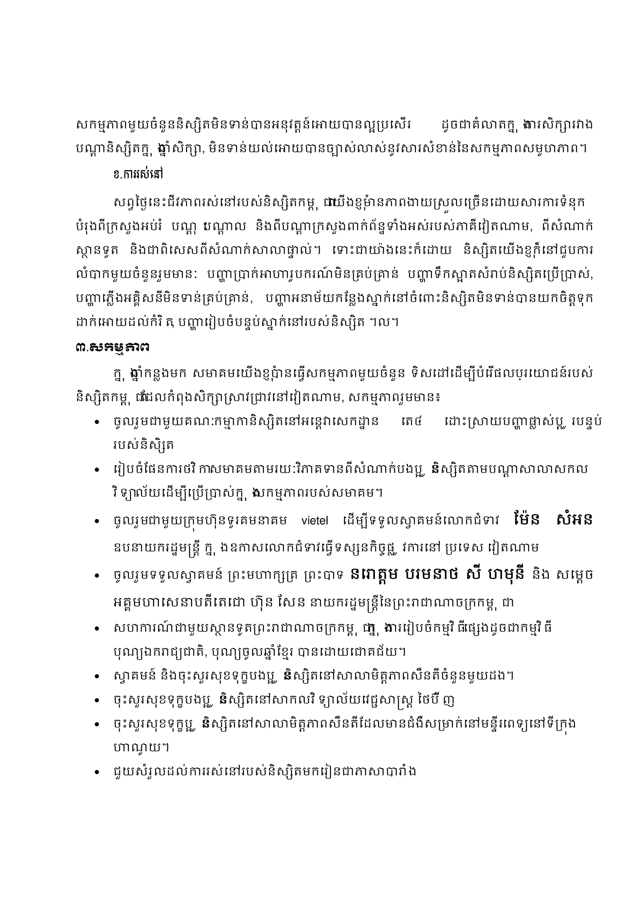 ពមួយចំនួននិស ិតមិន ន់ នអនុវតន៍េ យ នល បេសរ ដូច គំ តក ុ ង រសិក រ ង ប និស ិតក ុ ង ំសិក , មិន ន់យល់េ យ នច ស់ ស់នូវ រសំ ន់ៃនសកម ពសមូហ ព។ ខ. ររស់េ សពៃថេនះជីវ ពរស់េ របស់និស ិតកម ុ េយងខ ុ ំ ន ព យ សលេ ចនេ យ រ រទំនុក បំរុងពី កសួងអប់រ ំ បណុ ះ ប ល និងពីប កសួង ក់ព័ន ំងអស់របស់ គីេវ ត ម, ពីសំ ក់ នទូត និង ពិេសសពីសំ ក់ ល់។ េ ះ ៉ ងេនះក៏េ យ និស ិតេយងខក៏ំ េ ុ ជួប រ លំ កមួយចំនួនរួម នៈ ប ក់ រូបករណមិន គប់ ៍ ន់ ប ទឹក តសំ ប់និស ិតេ ប ស់, ប េភងអគិសនីមិន ន់ គប់ ន់, ប អ ម័យកែនង ក់េ ចំេ ះនិស ិតមិន ន់ នយកចិតទុក ក់េ យដល់កំរ ិ ត ប , េរ បចំបនប់ ក់េ របស់និស ិត ។ល។ ៣.សកម ព ក ុ ង ំកនងមក ស គមេយងខ ុ ំ នេធសកម ពមួយចំនួន ទិសេ េដម ីបំេរ ផលប្រេ ជន៍របស់ និស ិតកម ុ ែដលកំពុងសិក វ វេ េវ ត ម, សកម ពរួម ន៖ ចូលរួ ម មួយគណៈក និស ិតេ អេន េសក ន េត៤ េ ះ យប ស់ប ូ របនប់ របស់និសិ ត េរ បចំែផន រថវិ ស គម មរយៈវិ គ នពីសំ ក់បងប ូ ន ិស ិត មប សកល វិ ទ ល័យេដម ីេ ប ស់ក ុ ង កម ស ពរបស់ស គម។ ចូលរួ ម មួយ កមហ៊ុនទូរគម គម vietel េដម ីទទួល គមន៍េ កជំ វ ែម៉ន សំអន ឧប យករដម នី ក ុ ងឧ សេ កជំ វេធទស នកិចផ ូ វ រេ បេទស េវ ត ម ចូលរួ មទទួល គមន៍ ពះម ក ត ពះ ទ នេ តម បរម ថ សី ហមុនី និង សេមច អគម េស បតីេ តេ ហ៊ុ ន ែសន យករដម នីៃន ពះ ច កកម ុ សហ រណ៍ មួយ នទូត ពះ ច កកម ុ ក ុ ង រេរ បចំកមវ ិ ធីេផ ងដូច កមវិ ធី បុណ ឯក ជ តិ, បុណ ចូល ំែខរ នេ យេ គជ័យ។ គមន៍ និងចុះសួរសុខទុកបងប ូ ន ិស ិតេ មិត ពសឺនតីចំនួនមួយដង។ ចុះសួរសុខទុកបងប ូ ន ិស ិតេ កលវ ិ ទ ល័យេវជ ស ៃថប៊ ី ញ ចុះសួរសុខទុកប ូ ន ិស ិតេ មិត ពសឺនតីែដល នជំងឺស ក់េ មនីរេពទ េ ទី កង ណយ។ ូ ជួយសំរួលដល់ ររស់េ របស់និស ិតមកេរ ន ំង