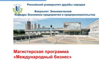 Магистерская программа 'международный бизнес' в Российском университете дружбы народов готовит специалистов в области внешнеэкономической деятельности и международного бизнеса, обучая их управлению международными проектами и взаимодействию с таможенными органами. Программа включает курсы по макроэкономике, международной торговле, и практику в российских и международных компаниях, что обеспечивает выпускникам высокие шансы на трудоустройство в транснациональных компаниях и финансовых учреждениях. Курс обучения длится 2 года и требует наличие диплома бакалавра и определенных языковых навыков.