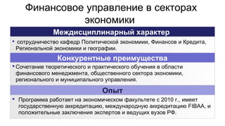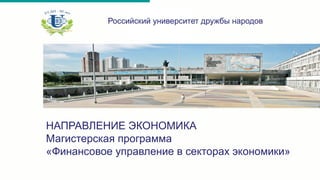 Магистерская программа «Финансовое управление в секторах экономики» в Российском университете дружбы народов стартовала в 2010 году и предлагает аккредитацию, совместное обучение и практический опыт. Она готовит специалистов для публичного сектора, регионального управления и финансовых институтов. Программа включает глубокое изучение финансового менеджмента и предоставляет возможности для карьерного роста в различных областях экономики.