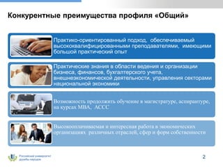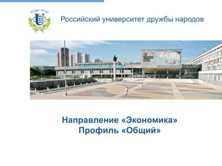 Документ представляет информацию о профильной программе 'общий' в направлении экономики Российского университета дружбы народов, подчеркнув практико-ориентированный подход и квалификацию преподавателей. Студенты получают теоретическую и практическую подготовку, включая обязательные и выборные дисциплины, с возможностью стажировок и трудоустройства в различнных сферах. Выпускники востребованы в экономических организациях и могут продолжить обучение в магистратуре или аспирантуре.