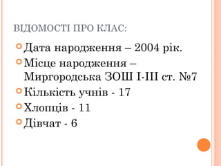 ВІДОМОСТІ ПРО КЛАС: