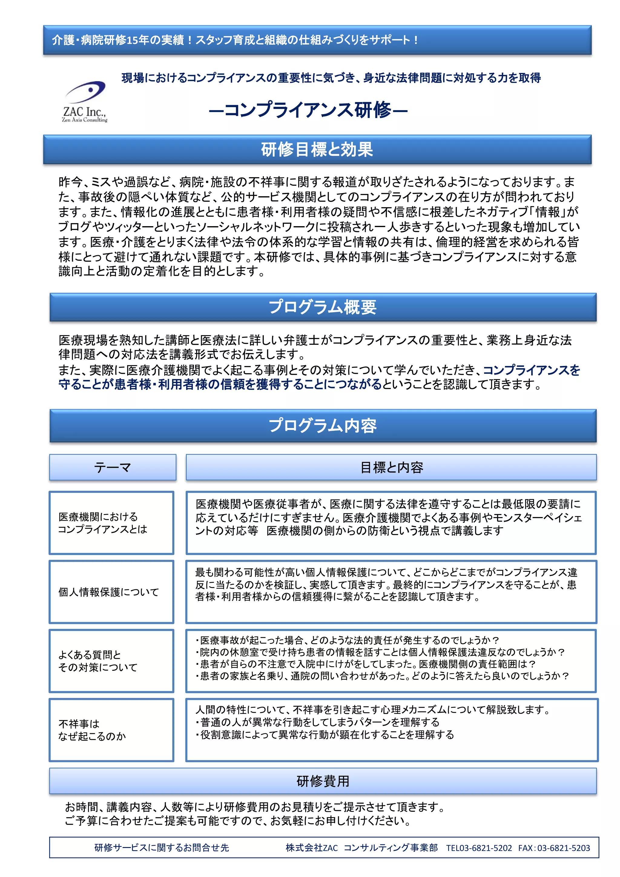 ミスや過誤など、病院・施設の不祥事に関する報道が取りざたされるようになっております。事故後の隠ぺい体質など、公的サービス機関としてのコンプライアンスの在り方が問われております。 倫理的経営を求められる皆様にとって避けて通れない課題に皆様の目を向けるべく、具体的事例に基づき意識向上と活動の定着化を目的とします。