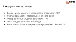 Доклад обсуждает реалии разработки программного обеспечения с акцентом на методологии agile, включая внедрение Scrum и Kanban. Рассматриваются преимущества гибких методологий, такие как улучшение качества продукта и предсказуемость сроков, а также опыт внедрения и рекомендации по переходу на новые практики. Также упоминаются важные аспекты взаимодействия в команде и необходимости постоянных улучшений в процессе разработки.
