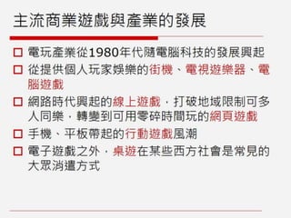 遊戲文化在主流的商業與產業發展下,主要作為提供大眾娛樂的用途,題材常與暴力與色情有關的這點也常被批評。然而,西方的遊戲設計師與學者,在近十年已提出不少反思,並創作出許多獨特的遊戲。這個簡報介紹了美國三位女性大學教授主導的遊戲案例,另外介紹三個有趣的理論框架,包括價值意識遊戲(Mary Flanagan)、道德遊戲設計(Miguel Sicart)和歷史問題空間(Jeremiah McCall)。如果你再思考如何設計非娛樂用途,靈感來自人文與社會議題的遊戲,非常值得參考!