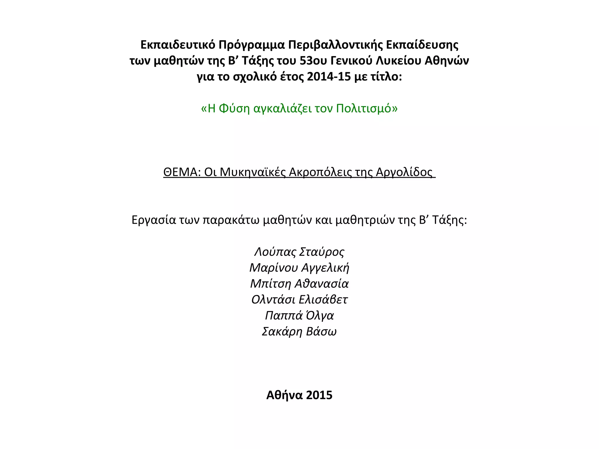 ΘΕΜΑ: Οι Μυκηναϊκές Ακροπόλεις της Αργολίδος