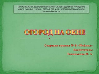 Документ представляет собой информацию о старшей группе No 8 «Пчёлка» и её воспитателе Томаньковой М. А. Он принадлежит муниципальному дошкольному образовательному учреждению «Центр развития ребёнка – детский сад No 12 «Непоседы» в городе Тында Амурской области.