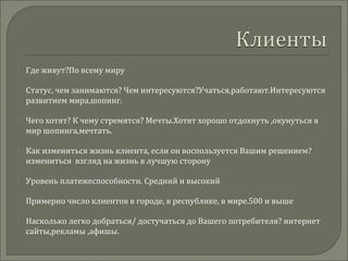 Документ описывает целевую аудиторию клиента, интересующегося шопингом и развитием мира, с акцентом на их мечты и ожидания от удачного отдыха. Указывается уровень платежеспособности, средний и высокий, а также количество потенциальных клиентов. Также обсуждаются проблемы и потребности клиентов, включая негативные аспекты шопинга и уровень боли их проблем.