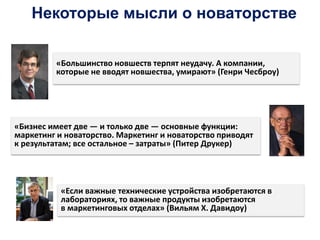 Документ обсуждает важность предпринимательской инициативы и инновационных идей для выживания компаний, приводя известные цитаты и примеры успешных инноваций. Он выделяет основные вопросы, которые компании должны учитывать в процессе инноваций, такие как источники идей и управление инновационной деятельностью. Также рассматриваются роли участников в инновационном процессе и связь между маркетингом и разработкой продуктов.