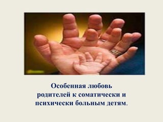 Документ обсуждает родительскую любовь и ее проявления в контексте воспитания больных детей, выделяя различные подходы родителей к заболеваниям и взаимодействию с детьми. Основное внимание уделяется эмоциональным проблемам, с которыми сталкиваются родители, и как они влияют на семейные отношения и адаптацию. Рассматриваются различные категории семей и типы вопросов, которые требуют психологической помощи, а также последствия хронических заболеваний для психоэмоционального состояния родителей и детей.