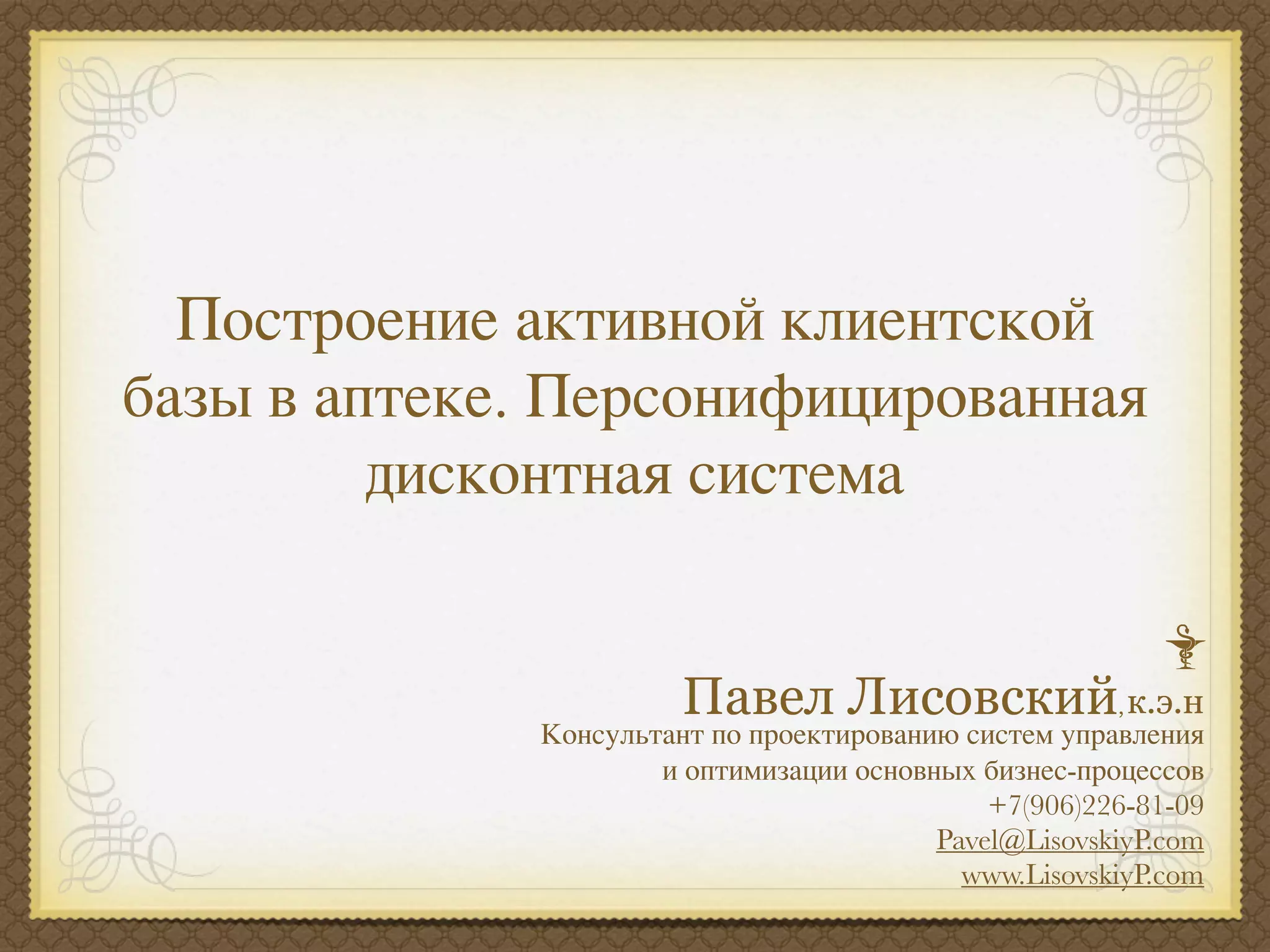 Документ описывает методики построения активной клиентской базы в аптеке через персонифицированную дисконтную систему и ABC-анализ. Основное внимание уделяется выявлению потребностей клиентов, повышению их лояльности и оптимизации бизнес-процессов для увеличения прибыльности аптечного бизнеса. Также представлены рекомендации по сбору информации о клиентах и организации системы обратной связи.