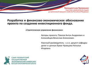 Документ представляет разработку инвестиционного фонда, цель которого — получение доходности выше среднерыночной при умеренных рисках с помощью диверсификации активов. Рассматриваются финансово-экономические аспекты, включая прогнозирование денежных потоков, определение точки безубыточности и стоимости фонда, а также моделируются различные сценарии финансовых результатов. Также выделяются ключевые риски и подводятся итоги эффективности реализации проекта.