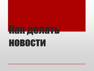 Документ детализирует процесс создания новостей, выделяя важность передачи информации и вовлечения аудитории. Он описывает основные факторы, определяющие новизну, и перечисляет требования к материалу для различных типов СМИ. Также рассматриваются типичные ошибки при создании новостей, которые могут снизить их качество и привлекательность.