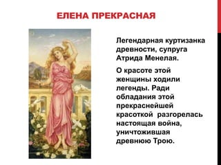 Документ описывает известных женщин, оказавших значительное влияние на историю и культуру, начиная с древних времен и заканчивая современностью. Перечислены такие фигуры, как Елена Прекрасная, Екатерина II, Жанна д'Арк, Мария Кюри и Двара Терешкова, каждая из которых внесла свой вклад в развитие общества в разных сферах. Также приведены их цитаты и достижения, подчеркивающие важность их исторической роли.