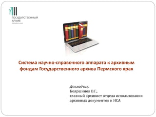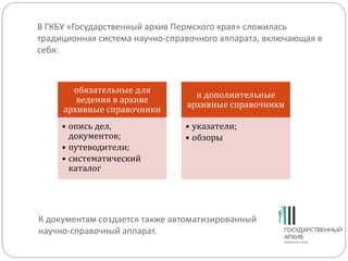 Доклад описывает систему научно-справочного аппарата государственного архива Пермского края, включающую архивные справочники, описи дел, путеводители и каталоги. Подробно рассматриваются процессы усовершенствования и переработки описей, а также необходимость применения современных информационных технологий для автоматизации архивной работы. Обсуждаются существующие проблемы, такие как отсутствие плана по улучшению описей и недостаток кадров для дальнейшего развития научно-справочного аппарата.