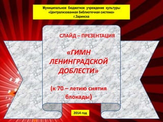 Презентация в честь 70-летия снятия блокады Ленинграда описывает ужасные условия жизни и страданий населения во время блокады с 8 сентября 1941 года по 27 января 1944 года. Подробно приводятся факты о голоде, смерти, труде детей и усилиях по защите города, а также о значимых культурных событиях, таких как премьера седьмой симфонии Шостаковича. Документ также акцентирует внимание на мемориалах и сохранении памяти о ленинградцах, переживших эти трагические события.