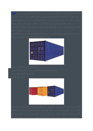 می بکار کاال نقل و حمل و وسایل و لوازم نگهداری برای فلزی های اتاقک مانند که ابعاد در را ها کانتینر این تواند می دپوماشین شرکت که است مشخصی و استاندارد ابعاد02( فوت6 و )متری02( فوت20خ و دوم دست ها کانتینر تمام .کند ارائه عزیز مشتریان به )متریکه هستند ارجی باشند می دیگر کشور چندین و سنگاپور و ژاپن ،امریکا ،چین همچون کشورهایی .محصول اندازه در فقط ایرانی های کانتینر02و کشتیرانی در استفاده برای الزم های استاندارد که شده تولید فوتی ندارند را دریایی نقل و .حمل . می استفاده ها آن کاری عایق برای رنگ و ضدزنگ از و بوده آهن های ورق از ها کانتینر بدنه جنس گیرد می قرار اندود روغن های تخته ها کانتینر کف ..شود ک ازجمله از گوناگونی موارد برای انتینر : طبیعی حوادث و بارندگی برابر در ها کاال و وسایل و لوازم نگهداری آسان بارگیری و کاال راحت انتقال فضا از بهتر استفاده استفابعادی استاندارد البته .شود می اده04یا و تولید ما کشور در که دارد وجود ها کانتینر برای نیز فوت مختلف های کاربرد برای مختلف ابعاد با ها کانتینر کلی حالت در .دارد کمتری کاربرد و شود نمی استفاده ا افراد دادن اسکان برای کانتینر از حالتیکه در .شوند می استفادهکاملتر کاری عایق از باید شود می ستفاده قید و شده برطرف جوشکار توسط کانتینر احتمالی منفذهای وضعیت این در .باشد برخوردار بهتری و