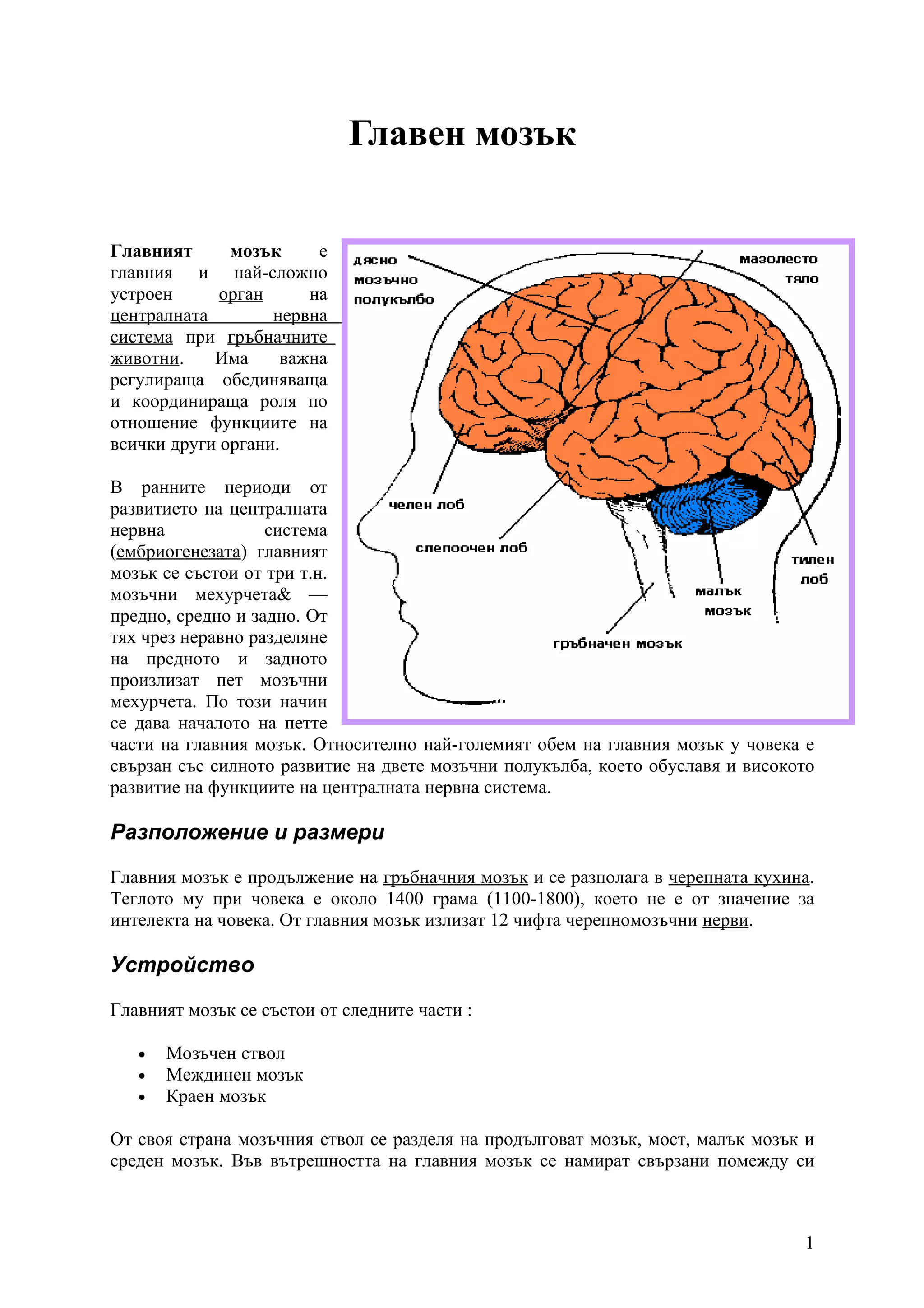 Главния мозък е продължение на гръбначния мозък и се разполага в черепната кухина.
