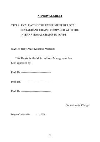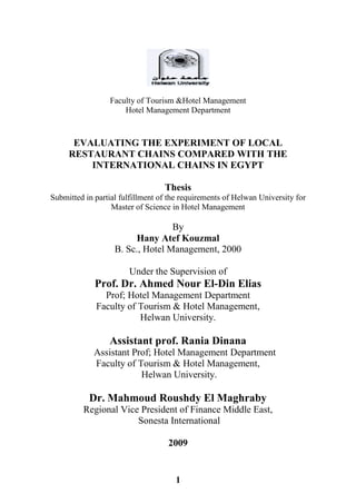 This thesis evaluates and compares local and international restaurant chains in Egypt, focusing on the fast food sector's growth and competition dynamics. It outlines research objectives, methodologies, and a literature review related to food service quality, operations, and customer preferences. The study aims to identify factors that local chains can enhance to compete effectively with their international counterparts.