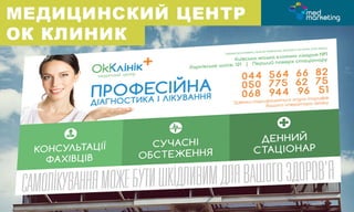 Почему вашей клинике нужен дизайн рекламной продукции? - Благодаря уникальному дизайну от агентства «MedMarketing», выполненному в корпоративных цветах вашей клиники, поток ваших клиентов увеличится. - Мы предложим разработку дизайна именно тех рекламных материалов, которые привлекут внимание вашей целевой аудитории, и подтолкнут к совершению дальнейшего нужного действия (звонок/обращение в клинику, запись на прием). http://www.medmarketing.ua/ Тел.: Киев +38 044 360-28-23 Тель-Авив +972 337-410-43 Москва +7 499 403-39-36