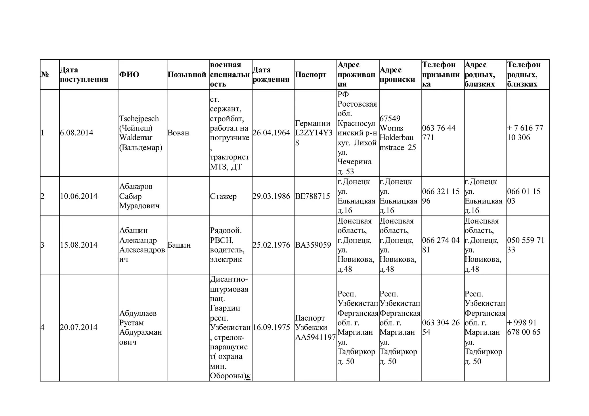 Документ представляет собой перечень призывников, включая их данные, такие как фамилия, имя, дата рождения, военная специальность и контактная информация. Содержит информацию о различных призывниках с 2014 года и несет сведения о их военно-учетных данных. Этот список кажется связанным с призывом на службу в армию и охватывает разные регионы и военные специализации.