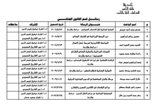 تتناول الوثيقة مجموعة من الرسائل القانونية المقدمة من طلاب الدراسات العليا في كلية الحقوق بجامعة بنها، حيث تشمل تفاصيل عن مواضيع الرسائل، أسماء المشرفين، وتواريخ التسجيل. يتضمن المستند 12 بحثًا مختلفًا يعكس التنوع في القضايا القانونية محل الدراسة، مثل دور الإثبات والاجراءات القانونية. تقدم الوثيقة معلومات هامة حول الاتجاهات البحثية في مجال القانون وتفاعل الطلاب مع مشرفيهم.