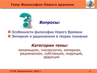 Документ посвящен философии нового времени, рассматривающей эмпиризм и рационализм как ключевые направления в теории познания. Особое внимание уделяется работам выдающихся философов, таких как Фрэнсис Бэкон, Рене Декарт и другие, и их методам познания, включая индукцию и дедукцию. Также обсуждаются учения о субстанции и предрассудках, влияющих на научное познание.