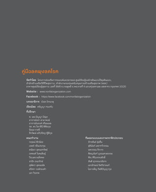 ส�ำนักงานกองทุนสนับสนุนการสร้างเสริมสุขภาพ (สสส.) อาคารศูนย์เรียนรู้สุขภาวะ เลขที่ 99/8 ซ.งามดูพลี ถ.พระรามที่ 4 แขวงทุ่งมหาเมฆ เขตสาทร กรุงเทพฯ 10120 Website : www.nonfatorganization.com Facebook : https://www.facebook.com/nonfatorganization บรรณาธิการ บังอร ไทรเกตุ เขียนโดย ศรัญญา ทองทับ ที่ปรึกษา ศ. นพ.ปัญญา ไข่มุก อาจารย์สง่า ดามาพงษ์ อาจารย์ณรงค์ เทียมเมฆ รศ. ดร.วิลาสินี พิพิธกุล นิรมล ราศรี ธีรวัฒน์ อภิปรัชญาฐิติกุล คณะท�ำงาน กฤษณ์ ฟักน้อย เจตต์ กลิ่นประทุม ดนัยยา สุคนธทรัพย์ ภคพงศ์ วิเศษสินธุ์ วีระเดช ผเด็จพล สาธิก ธนะทักษ์ สุพัตรา สุคนธมัต อริสรา วงษ์ทองค�ำ เอก วิรเทพ ทีมออกแบบและภาพกราฟิกประกอบ จักรพันธ์ ชุ่มชื่น ชุตินันท์ เตชาทวีวรรณ นพวรรณ จิรากร พิชญนันท์ บูรณเศวตธรรม พีระ ศิริบรรจงศักดิ์ สันติ สุวรรณวลัยกร เอกลักษณ์ จิตทิชานนท์ โอภาเพ็ญ กิตติปัญญากุล