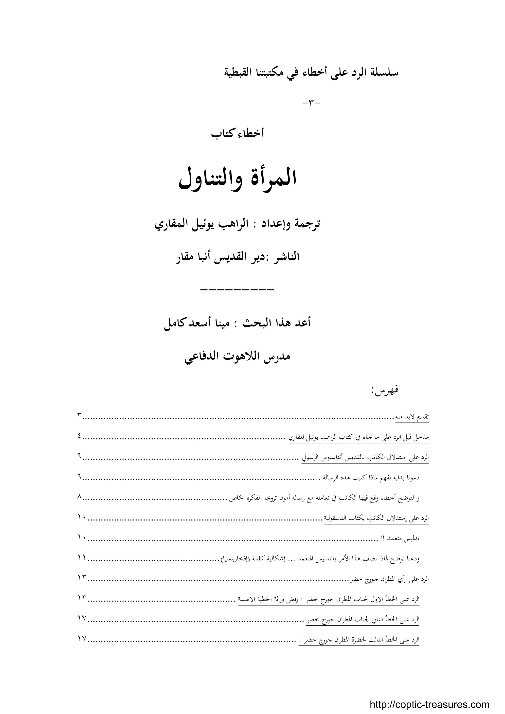 ، اﻟﻘﺪاس اﺿﻊو ﻳﻮسرﻳﻐﻮﺮﻏ اﻟﻘﺪﻳﺲ اﻧﻪ اﻟﻘﺎرئ ﻳﻌﺘﻘﺪ ﺣﱴ ﻣﺘﻌﻤﺪ ﻟﺘﺪﻟﻴﺲ ﻫﺬا ﰲ ﺛﻮذﻛﺴﻴﺔراﻻ ﻛﻨﻴﺴﺘﻨﺎاﻟﻪﻮﺑﺄﻗ وﻻ ﺑﻪ ﺗﻌﱰف وﻻ ، اﺻﻼ ﺛﻮذﻛﺴﻲرا ﻏﲑ. ﻟ ﻗﻮﻩ ﻣﻦ اﷲ اﻳﺎﻩ ﻣﻨﺤﻨﺎ ﻣﺎ ﻛﻞاﺟﺒﻨﺎو ، اﻟﺮب أﻋﺎﻧﻨﺎ ﻫﻨﺎ إﱄﺪﺣﺾﻟﻜﺘﺎب اﻟﻔﺎﺳﺪ اﻟﺘﻌﻠﻴﻢ ﺗاﺟﻌﻪﺮﲟ ﺳﺄﻗﻮم ﺑﺄﻧﲏ ﻓﺄﻋﺪ ﻧﻘﺎط اﻳﻪ ﻣﻨﺎ اﻮﺳﻬ ﺳﻘﻂ ﻛﺎن انو ، اﳌﻘﺎري ﻳﻮﺋﻴﻞ اﻫﺐﺮﻟﻠ أةﺮاﳌ ﻨﺎول ﻓﱰة اﻟﺘﻨﺎول ﻋﻦ أةﺮاﳌ ﲤﻨﻊ ﳌﺎذا ﻳﻮﺿﺢ ﺑﺸﻜﻞ اﻟﺴﺎﺑﻖ اﻟﺮد ﺻﻴﺎﻏﺔ ﺑﺈﻋﺎدة ﺳﺄﻗﻮم ﻛﻤﺎ ، اﻟﻜﺘﺎب ﻣﻨﺎﻗ ﻋﻦ ﻟﻪوﺗﺪا ﻳﺘﻢ ﳌﺎ اﺮﻧﻈ اﳌﻘﺪس ﻟﻠﻤﺠﻤﻊ ارﺳﺎﳍﺎ ﻳﺘﻢ ان ﺗﻠﻴﻖ ﺻﻴﺎﻏﺔ ﻣﻊ ، ﻃﻤﺜﻬﺎﻫﺬا ﺸﺔ اﻟﻘﺎدﻣﺔ ﺗﻪردو ﺧﻼل اﻟﻜﺘﺎب اﺗﻜﻢﻮﺻﻠ ﰲ اذﻛﺮوﱐ ﻛﺎﻣﻞاﺳﻌﺪ ﻣﻴﻨﺎ اﻟﺪﻓﺎﻋﻲ اﻟﻼﻫﻮت ﻣﺪرس اﻟﻌﻬﺪ ﺧﻤﻴﺲ٢٠ﺑﺮﻣﻮدة١٧٣٢ش ٢٨/٤/٢٠١٦ http://coptic-treasures.com
