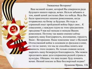 Документ содержит heartfelt обращения к ветеранам Великой Отечественной войны, выражающие глубокую благодарность за их подвиг и жертвы, принесенные ради будущего поколений. Автор(ы) отмечают важность сохранения памяти о войне и героизме ветеранов, которые защитили родину и обеспечили мирное время для следующих поколений. Эти письма являются отражением уважения и гордости молодежи за наследие, оставленное ветеранами, и обещанием продолжать их дело.