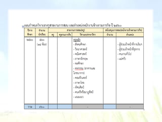 (2559-2561) โรงเรียนดวงกมล ปี จานวน ระดับชั้น จานวน จานวน หมายเหตุอนุบาล 1 อนุบาล 2 อนุบาล 3 บุคลากรปัจจุบัน ที่ต้องการเพิ่ม 2559 ห้อง 1 1 2 4 อนุบาลห้อง นักเรียน 30 30 60 120 ครู/ผช.ครู 1 2 2 4 ผดด. 1 2 2 4 2560 ห้อง 1 1 1 3 นักเรียน 30 30 30 90 ครู 1 1 2 4 ผดด. 1 1 2 4 2561 ห้อง 1 1 1 3 นักเรียน 30 30 30 90 ครู 1 1 1 4 ผดด. 1 1 1 4