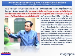 นธรรม ยึดหลักการบริหาร กิจการบ้านเมืองที่ดี การบริหารจัดการ ภาครัฐแบบใหม่ การตอบสนองความ ต้องการของประชาชนในฐานะที่เป็ น ศูนย์กลาง และการอานวยความสะดวกแก่ ผู้ใช้บริการเพื่อสร้างความเชื่อมั่นวางใจใน ระบบราชการ ลดต้นทุนดาเนินการของภาค ธุรกิจ เพิ่มศักยภาพในการแข่งขันกับนานา ประเทศ และการรักษาบุคลากรภาครัฐที่มี ประสิทธิภาพไว้ในระบบราชการ” คาแถลงนโยบายของคณะรัฐมนตรี พลเอกประยุทธ์ จันทร์โอชา นายกรัฐมนตรี ที่แถลงต่อสภานิติบัญญัติแห่งชาติ เมื่อวันศุกร์ที่ ๑๒ กันยายน ๒๕๕๗ ๑๐.๑ “ปรับปรุงระบบราชการในด้านองค์กรหรือหน่วยงานภาครัฐทั้งในระดับ ประเทศ ภูมิภาค และท้องถิ่น ทบทวนการจัดโครงสร้างหน่วยงานภาครัฐที่มีอานาจ หน้าที่ซ้าซ้อนหรือลักลั่นกันหรือมีเส้นทางการปฏิบัติที่ยืดยาว ปรับปรุงวิธีปฏิบัติ ราชการให้ทันสมัยโดยนาเทคโนโลยีมาใช้ infographic