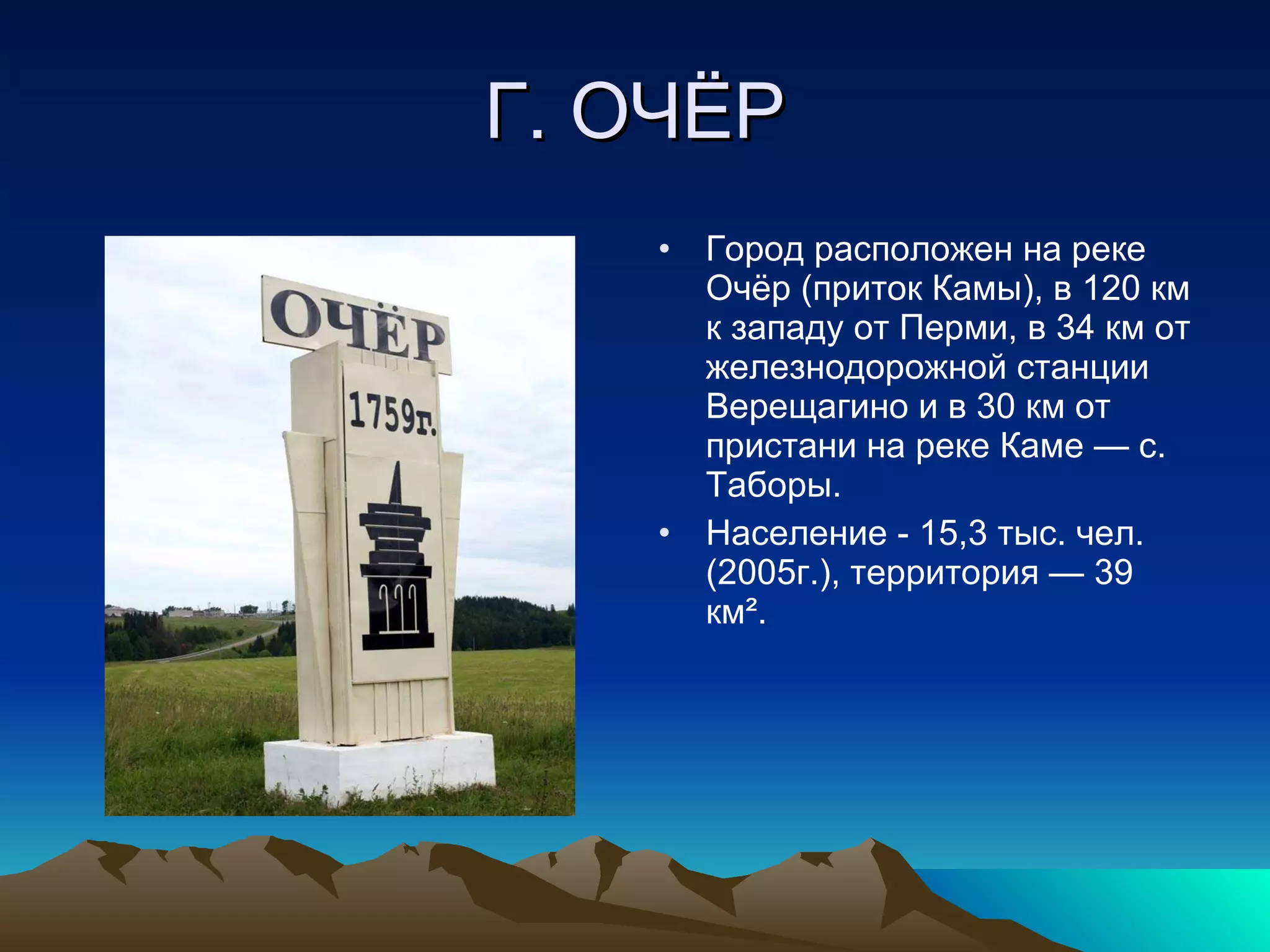 Город Очёр находится на реке Очёр в 120 км от Перми, с населением 15,3 тыс. человек и площадью 39 км². В документе описаны ключевые достопримечательности города, такие как очерский пруд, солнечные часы, церковь Михаила Архангела и музей имени А.В. Нецветаева, а также уникальный палеонтологический памятник с останками пермских ящеров. Очёр также известен своим историческим значением и архитектурными памятниками.