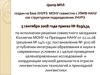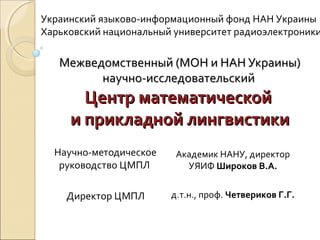 Центр математической и прикладной лингвистики (ЦМПЛ) создан для интеграции науки и образования, а также для координации исследований в области лингвистических технологий. Основные направления работы включают разработку новых лингвистических технологий, исследование украинского языка и взаимодействие с другими языками, а также подготовку квалифицированных кадров. Проект Mondilex, в рамках которого участвуют несколько стран, фокусируется на создании высококачественных ресурсов в области славянской лексикографии.