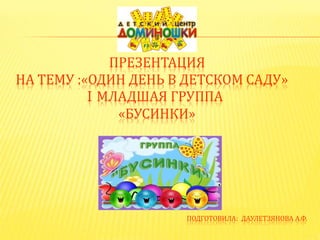 Презентация описывает день в детском саду для младшей группы 'Бусинки', включая активности детей, такие как зарядка, игры, занятия искусством и уход за собой. Также подчеркивается важность режима и гигиенических навыков, а также позитивная атмосфера в детском саду. В завершение говорятся добрые слова о возвращении в детский сад.