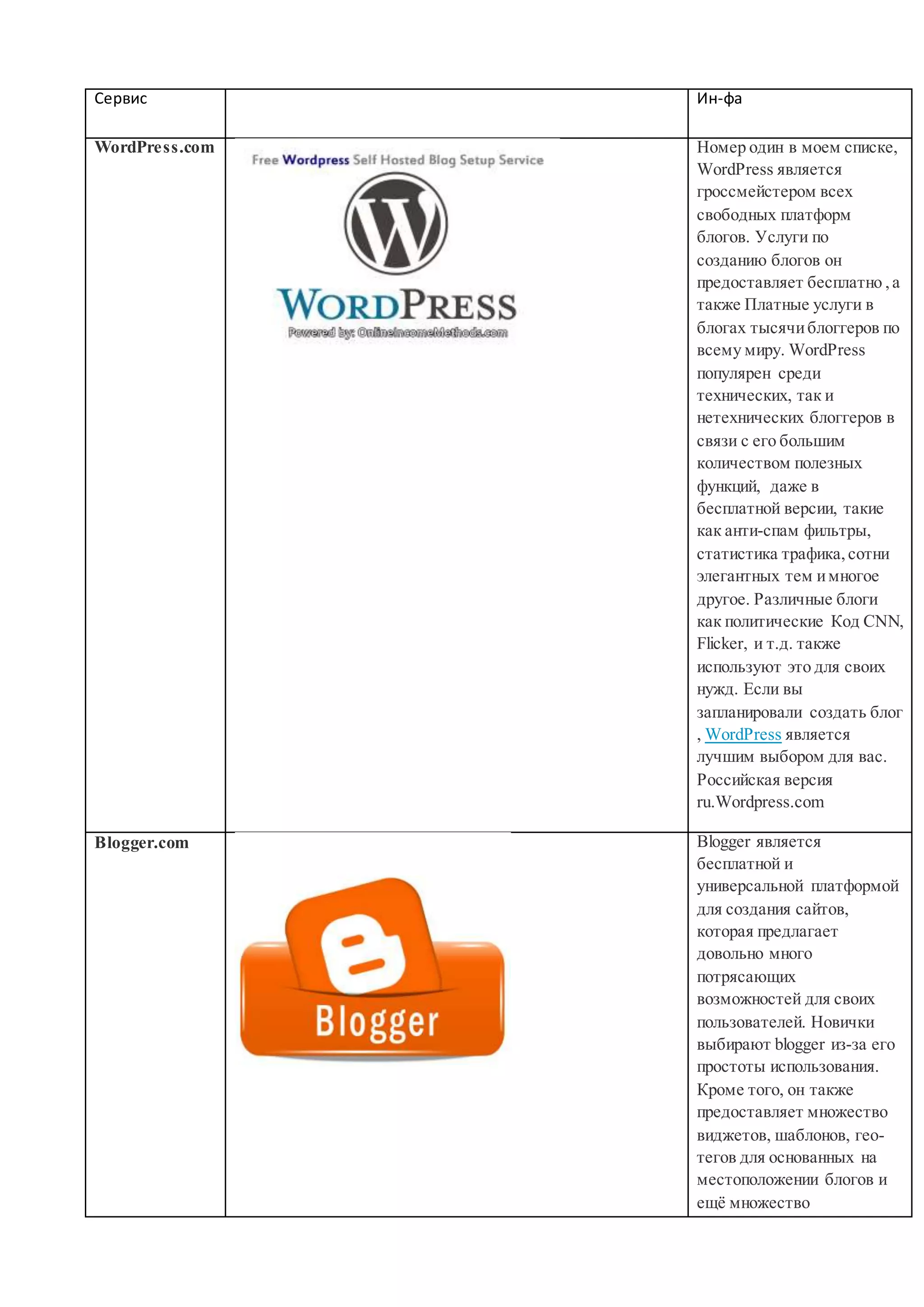 Документ описывает основные платформы для создания блогов, такие как WordPress, Blogger, Tumblr, LiveJournal, Weebly, Typepad и Blog.com, выделяя их ключевые функции и преимущества. WordPress занимает лидирующую позицию благодаря множеству функций даже в бесплатной версии, в то время как Blogger и Weebly считаются простыми и универсальными для новичков. Каждая платформа имеет свои особенности, делая выбор между ними зависимым от индивидуальных потребностей блоггеров.