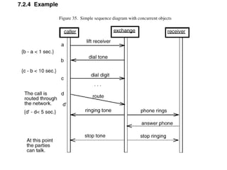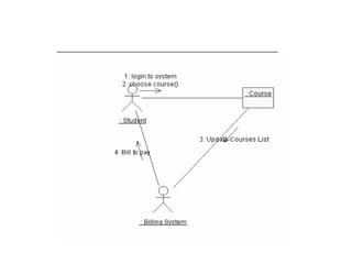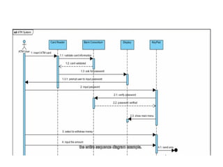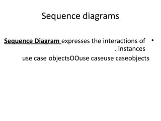 The document provides an overview of sequence diagrams, detailing their use for representing interactions between instances in various programming scenarios. It describes the nature of messages exchanged (synchronous, asynchronous, return messages, constructors, and destructors) and illustrates object lifetimes and states through various notations. Additionally, it briefly introduces collaboration diagrams and a state chart for a login process in an online banking system.
