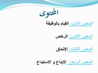 يتناول الوثيقة تنظيم حقوق الموظفين في مجال الرخص والإجازات وفقًا للقوانين المتعلقة بالوظيفة العامة. يشمل ذلك تفاصيل حول أنواع الرخص، مثل الرخص السنوية، والرخصة لأسباب عائلية، ورخص المرض، بالإضافة إلى مستحقات الموظف أثناء تلك الرخص. كما يوضح الوثيقة الإجراءت المتعلقة بتقديم الطلبات والمستندات المطلوبة للحصول على هذه الرخص.