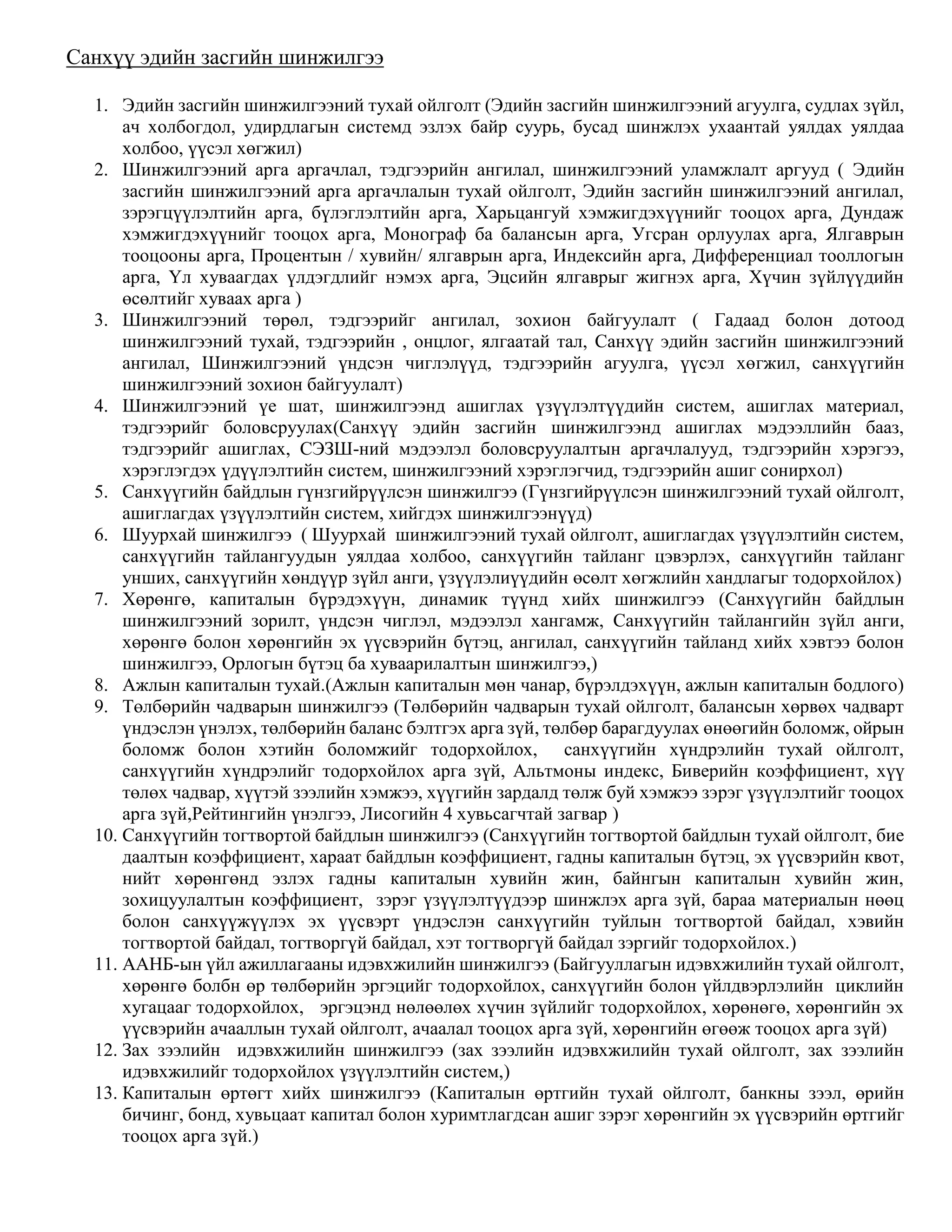 шинжилгээ 1. Эдийн засгийн шинжилгээний тухай ойлголт (Эдийн засгийн шинжилгээний агуулга, судлах зүйл, ач холбогдол, удирдлагын системд эзлэх байр суурь, бусад шинжлэх ухаантай уялдах уялдаа холбоо, үүсэл хөгжил) 2. Шинжилгээний арга аргачлал, тэдгээрийн ангилал, шинжилгээний уламжлалт аргууд ( Эдийн засгийн шинжилгээний арга аргачлалын тухай ойлголт, Эдийн засгийн шинжилгээний ангилал, зэрэгцүүлэлтийн арга, бүлэглэлтийн арга, Харьцангуй хэмжигдэхүүнийг тооцох арга, Дундаж хэмжигдэхүүнийг тооцох арга, Монограф ба балансын арга, Угсран орлуулах арга, Ялгаврын тооцооны арга, Процентын / хувийн/ ялгаврын арга, Индексийн арга, Дифференциал тооллогын арга, Үл хуваагдах үлдэгдлийг нэмэх арга, Эцсийн ялгаврыг жигнэх арга, Хүчин зүйлүүдийн өсөлтийг хуваах арга ) 3. Шинжилгээний төрөл, тэдгээрийг ангилал, зохион байгуулалт ( Гадаад болон дотоод шинжилгээний тухай, тэдгээрийн , онцлог, ялгаатай тал, Санхүү эдийн засгийн шинжилгээний ангилал, Шинжилгээний үндсэн чиглэлүүд, тэдгээрийн агуулга, үүсэл хөгжил, санхүүгийн шинжилгээний зохион байгуулалт) 4. Шинжилгээний үе шат, шинжилгээнд ашиглах үзүүлэлтүүдийн систем, ашиглах материал, тэдгээрийг боловсруулах(Санхүү эдийн засгийн шинжилгээнд ашиглах мэдээллийн бааз, тэдгээрийг ашиглах, СЭЗШ-ний мэдээлэл боловсруулалтын аргачлалууд, тэдгээрийн хэрэгээ, хэрэглэгдэх үдүүлэлтийн систем, шинжилгээний хэрэглэгчид, тэдгээрийн ашиг сонирхол) 5. Санхүүгийн байдлын гүнзгийрүүлсэн шинжилгээ (Гүнзгийрүүлсэн шинжилгээний тухай ойлголт, ашиглагдах үзүүлэлтийн систем, хийгдэх шинжилгээнүүд) 6. Шуурхай шинжилгээ ( Шуурхай шинжилгээний тухай ойлголт, ашиглагдах үзүүлэлтийн систем, санхүүгийн тайлангуудын уялдаа холбоо, санхүүгийн тайланг цэвэрлэх, санхүүгийн тайланг унших, санхүүгийн хөндүүр зүйл анги, үзүүлэлиүүдийн өсөлт хөгжлийн хандлагыг тодорхойлох) 7. Хөрөнгө, капиталын бүрэдэхүүн, динамик түүнд хийх шинжилгээ (Санхүүгийн байдлын шинжилгээний зорилт, үндсэн чиглэл, мэдээлэл хангамж, Санхүүгийн тайлангийн зүйл анги, хөрөнгө болон хөрөнгийн эх үүсвэрийн бүтэц, ангилал, санхүүгийн тайланд хийх хэвтээ болон шинжилгээ, Орлогын бүтэц ба хуваарилалтын шинжилгээ,) 8. Ажлын капиталын тухай.(Ажлын капиталын мөн чанар, бүрэлдэхүүн, ажлын капиталын бодлого) 9. Төлбөрийн чадварын шинжилгээ (Төлбөрийн чадварын тухай ойлголт, балансын хөрвөх чадварт үндэслэн үнэлэх, төлбөрийн баланс бэлтгэх арга зүй, төлбөр барагдуулах өнөөгийн боломж, ойрын боломж болон хэтийн боломжийг тодорхойлох, санхүүгийн хүндрэлийн тухай ойлголт, санхүүгийн хүндрэлийг тодорхойлох арга зүй, Альтмоны индекс, Биверийн коэффициент, хүү төлөх чадвар, хүүтэй зээлийн хэмжээ, хүүгийн зардалд төлж буй хэмжээ зэрэг үзүүлэлтийг тооцох арга зүй,Рейтингийн үнэлгээ, Лисогийн 4 хувьсагчтай загвар ) 10. Санхүүгийн тогтвортой байдлын шинжилгээ (Санхүүгийн тогтвортой байдлын тухай ойлголт, бие даалтын коэффициент, хараат байдлын коэффициент, гадны капиталын бүтэц, эх үүсвэрийн квот, нийт хөрөнгөнд эзлэх гадны капиталын хувийн жин, байнгын капиталын хувийн жин, зохицуулалтын коэффициент, зэрэг үзүүлэлтүүдээр шинжлэх арга зүй, бараа материалын нөөц болон санхүүжүүлэх эх үүсвэрт үндэслэн санхүүгийн туйлын тогтвортой байдал, хэвийн тогтвортой байдал, тогтворгүй байдал, хэт тогтворгүй байдал зэргийг тодорхойлох.) 11. ААНБ-ын үйл ажиллагаан