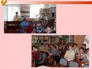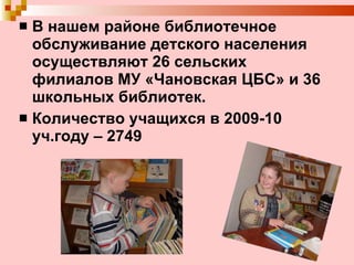 В документе описывается работа детских библиотек в районе, включая 26 сельских филиалов и 36 школьных библиотек, которые обслуживают 2749 учеников, предоставляя литературные программы и мероприятия. Основное внимание уделяется развитию читающей культуры, семейного чтения и патриотического воспитания среди детей. Также упоминаются разнообразные конкурсы и клубы, направленные на привлечение детей к чтению и экологии.