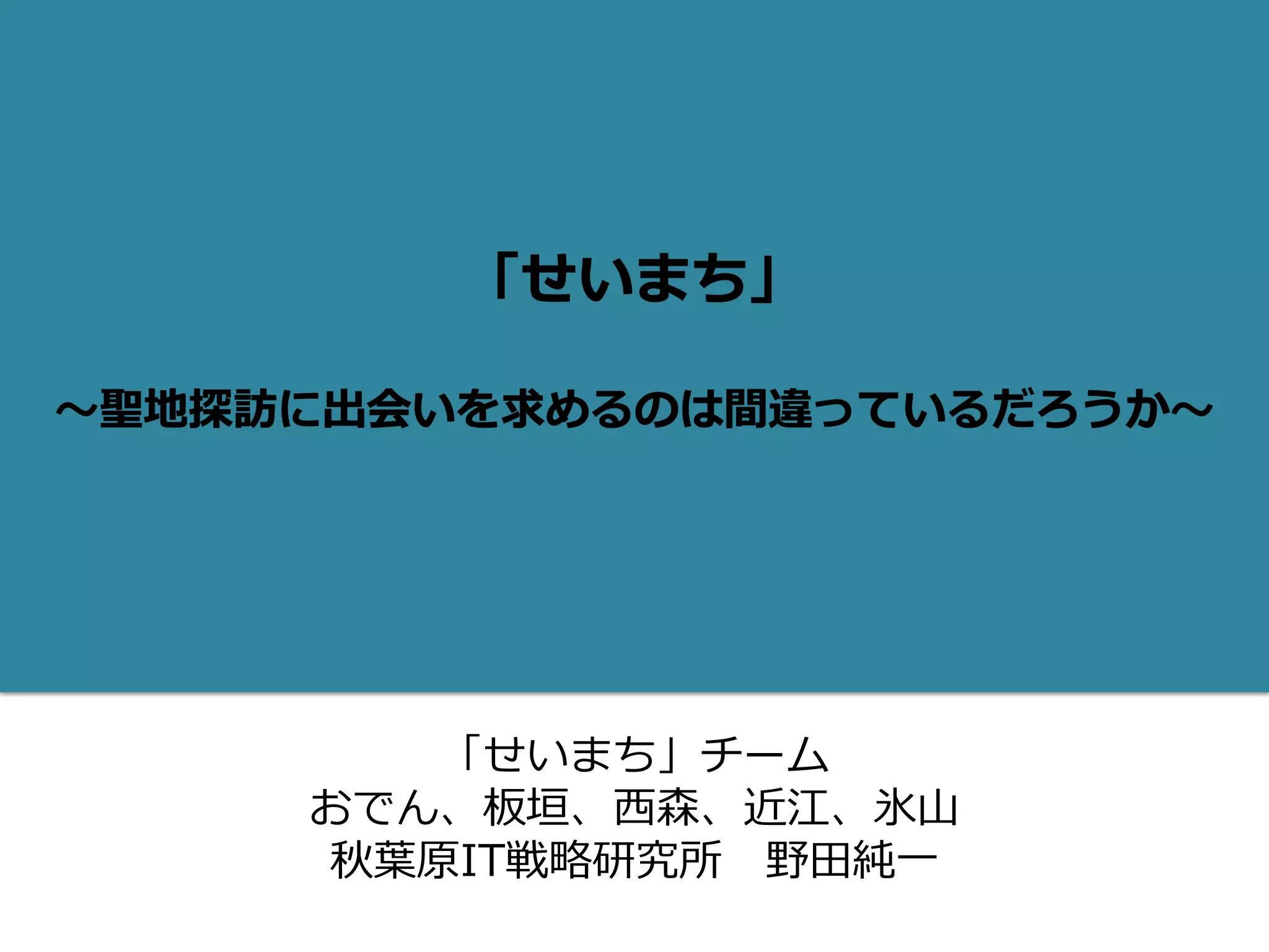 5/14~16で開催された スタートアップウィークエンド東京 Animeの「せいまち」チームのプレゼン資料です。 http://tokyo.startupweekend.org/