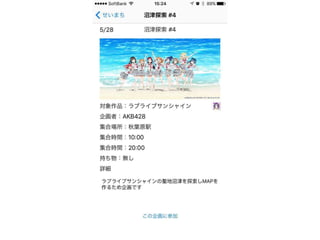 「せいまち」とは 「せいまち」というサービスは、 聖地探訪(舞台探訪)し自分でアニメの聖地スポットを探した いアニメファン向けの、アプリです。 ユーザーは自分が聖地スポットを発見した証明を残すことが でき、またチームで聖地探訪する仲間を募ることができます。 「聖地巡礼マップ」「にじたび」とは違って、 聖地スポット探索欲求を満たす機能が備わっている事が特徴 です。