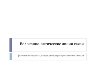 Документ представляет собой обзор волоконно-оптических линий связи, включая историю развития технологий, ключевые достижения и принципы функционирования. Он описывает физические процессы, такие как распространение света в оптических волокнах и основные параметры, включая затухание, дисперсию и полосу пропускания. Также рассматриваются преимущества и недостатки оптоволоконных систем связи.