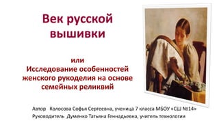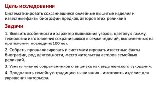 Документ представляет собой исследование особенностей женского рукоделия и систематизации семейных вышитых реликвий, проведенное ученицей 7 класса Софьей Колосовой под руководством Татьяны Думаненко. Исследование включает анализ вышивки, биографий предков и мнение современников, а также показывает развитие традиций вышивания в семье за последние 100 лет. Главными результатами являются создание генеалогического древа и повышение интереса к ручной вышивке как виду женского рукоделия.