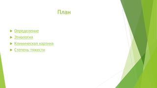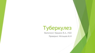 Документ описывает туберкулез как инфекционное заболевание, вызываемое микобактерией туберкулеза, которая передается воздушно-капельным путем. Он также рассматривает клиническую картину, характеризующуюся начальной бессимптомностью, и факторы, способствующие развитию болезни, такие как курение и алкоголизм. Туберкулез проходит через различные стадии, от латентной инфекции до открытой формы, проявляющейся выраженными симптомами.