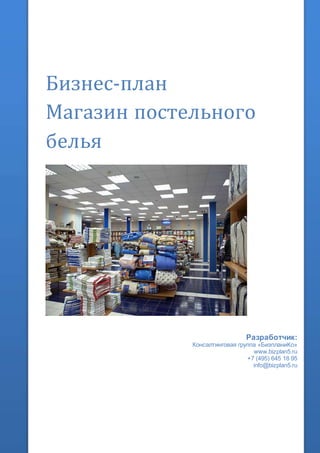 Документ представляет собой бизнес-план для магазина постельного белья с оценкой рынка, планом запуска, финансовым анализом и инвестиционными стратегиями. Рассматриваются три варианта запуска бизнеса, требующие от 5 до 150 млн. рублей, с ожидаемой прибылью от 250 до 2 млн. рублей в месяц и сроками окупаемости от 1 до 3 лет. Анализ финансовых показателей показывает высокую инвестиционную привлекательность проекта с устойчивыми темпами роста рынка.