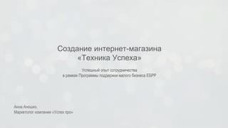 Документ описывает создание интернет-магазина 'техника успеха' и успешный опыт сотрудничества с программой поддержки малого бизнеса ЕБРР. Указывается структура проекта, этапы его реализации, включая подготовку и подачу документов, выбор консультанта и бюджет. Итогом проекта стал запуск интернет-магазина www.texus.by, предоставляющего широкий ассортимент компьютерной техники.