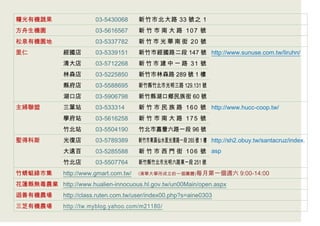 该文档列出了新竹地区的有机商店及网店,包括其名称、联系电话和地址。此外,文档提供了一些有机农场和相关网站的信息,方便公众获取更健康的有机产品。