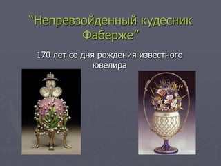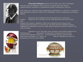 Петер Карл Фаберже, известный ювелир, родился 30 мая 1846 года в Санкт-Петербурге и стал лидером в производстве уникальных ювелирных изделий. Его творения, включая знаменитые пасхальные яйца, пользовались огромным спросом среди российской королевской семьи и других монархов, а фирма Фаберже добилась значительных успехов на международной арене. Однако, после революции 1917 года, производство прекратилось, и Фаберже скончался в 1920 году в изгнании, а его наследие продолжает жить в коллекциях по всему миру.