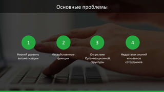 Документ рассматривает основные проблемы бухгалтерии, такие как низкий уровень автоматизации и недостаток квалификации сотрудников, а также предлагает решения для повышения её эффективности. Приведен кейс компании, в котором выявлены значительные потери времени и возможности для оптимизации процессов, что может повысить производительность учета. Обсуждаются квалификационные требования и задачи главного бухгалтера для создания эффективного и высококвалифицированного рабочего коллектива.